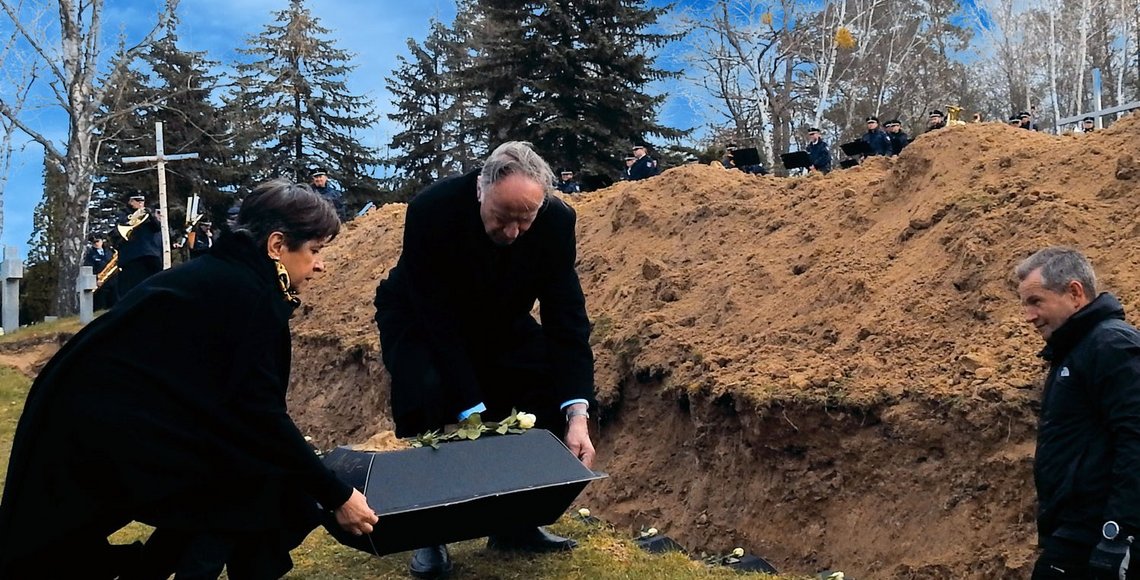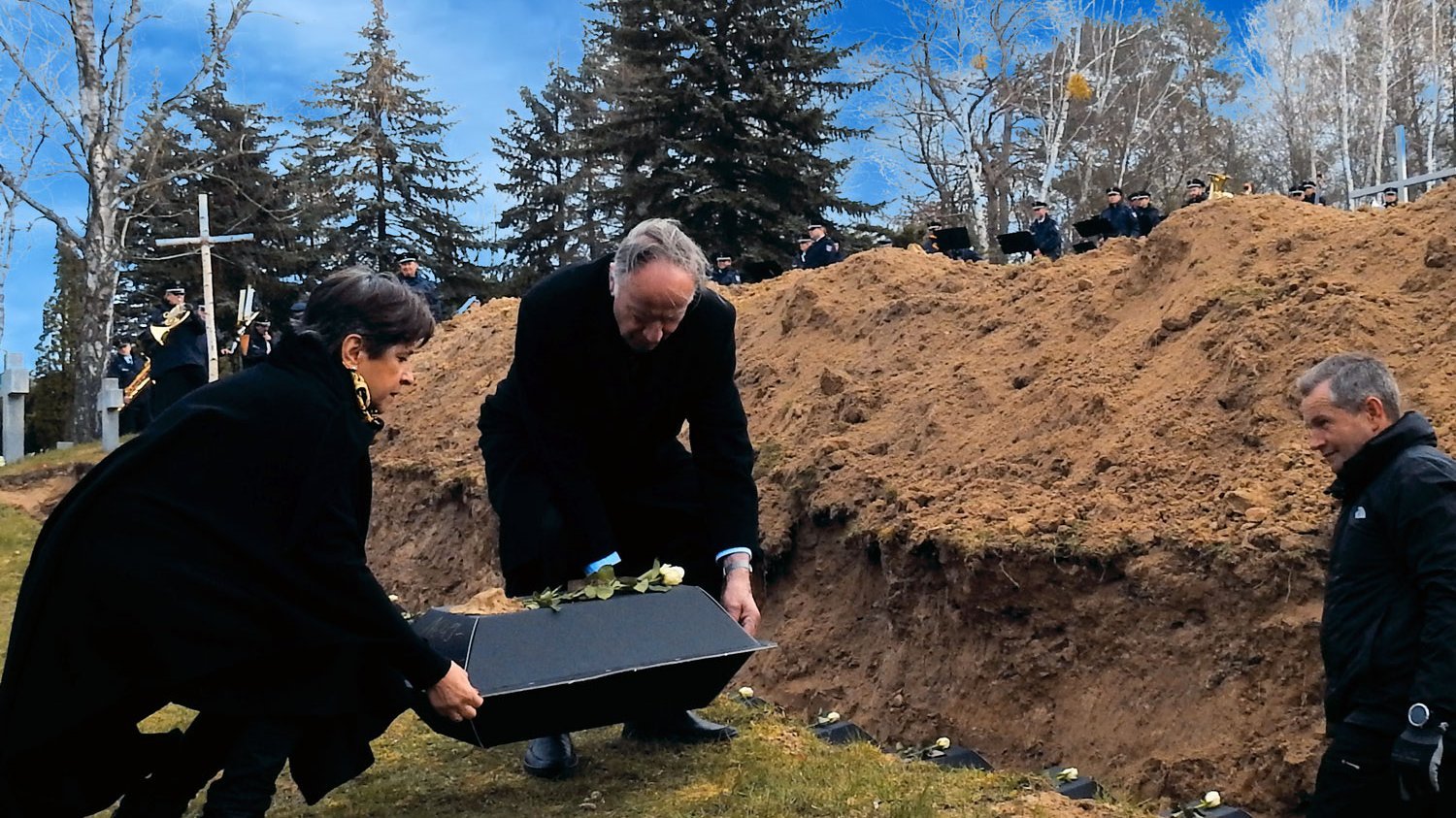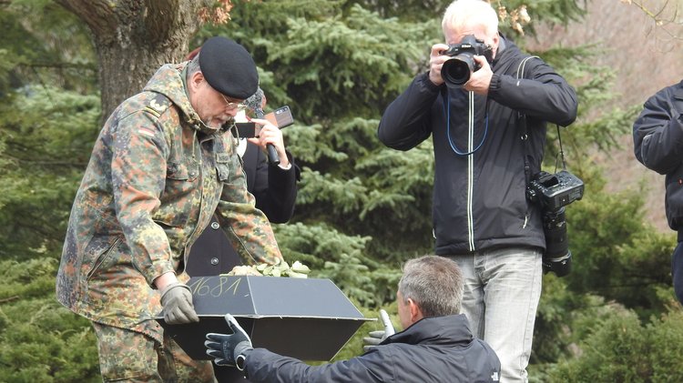 Ebenfalls eine Premiere für die wenigen Gäste. Da coronabedingt keine Abteilung der Bundeswehr die Einbettung mit Joachim Kozlowski durchführen konnte, waren die Honoratioren aufgefordert, die Särge zur letzte Ruhe zu reichen. Mit großem Ernst erfüllten Oberst Olaf Detlefsen, Kdr. Landeskommando Brandenburg, Friedmann Hanke, 1. Beigeordneter Landkreis Seelow-Land, Christian Heinrich-Jaschinski, Landrat Landkreis Elbe-Elster, Roswitha Thiede, Amtsdirektorin, Amtsverwaltung Seelow-Land sowie weitere hilfreiche Hände diesen letzten Dienst.