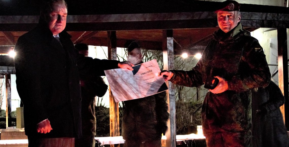 Landesgeschäftsführer Oliver Breithaupt würdigte den scheidenden Kommandeur seines Partnerbataillons in Beelitzfür die außergewöhnliche und beispielhafte Unterstützung. Ob direkt und persönlich oder auch durch Anweisungen bzw. Zustimmungen, Dr. Henschke sorgte an seinem Standort immer für eine vertrauensvolle, komplikationslose und letztlich sehr erfolgreiche Zusammenarbeit mit dem Volksbund.