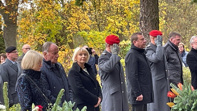 Auf dem Friedhof der kleinen Stadt in der Uckermark legten dann Vertreter des Landes, der Landkreise und der Bundeswehr ihr Kränze nieder und Bischof Felmberg spach mit fester Stimme den Segen.