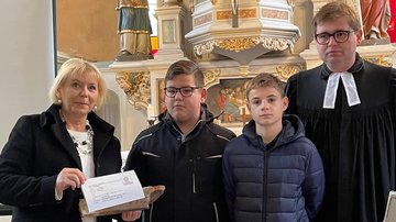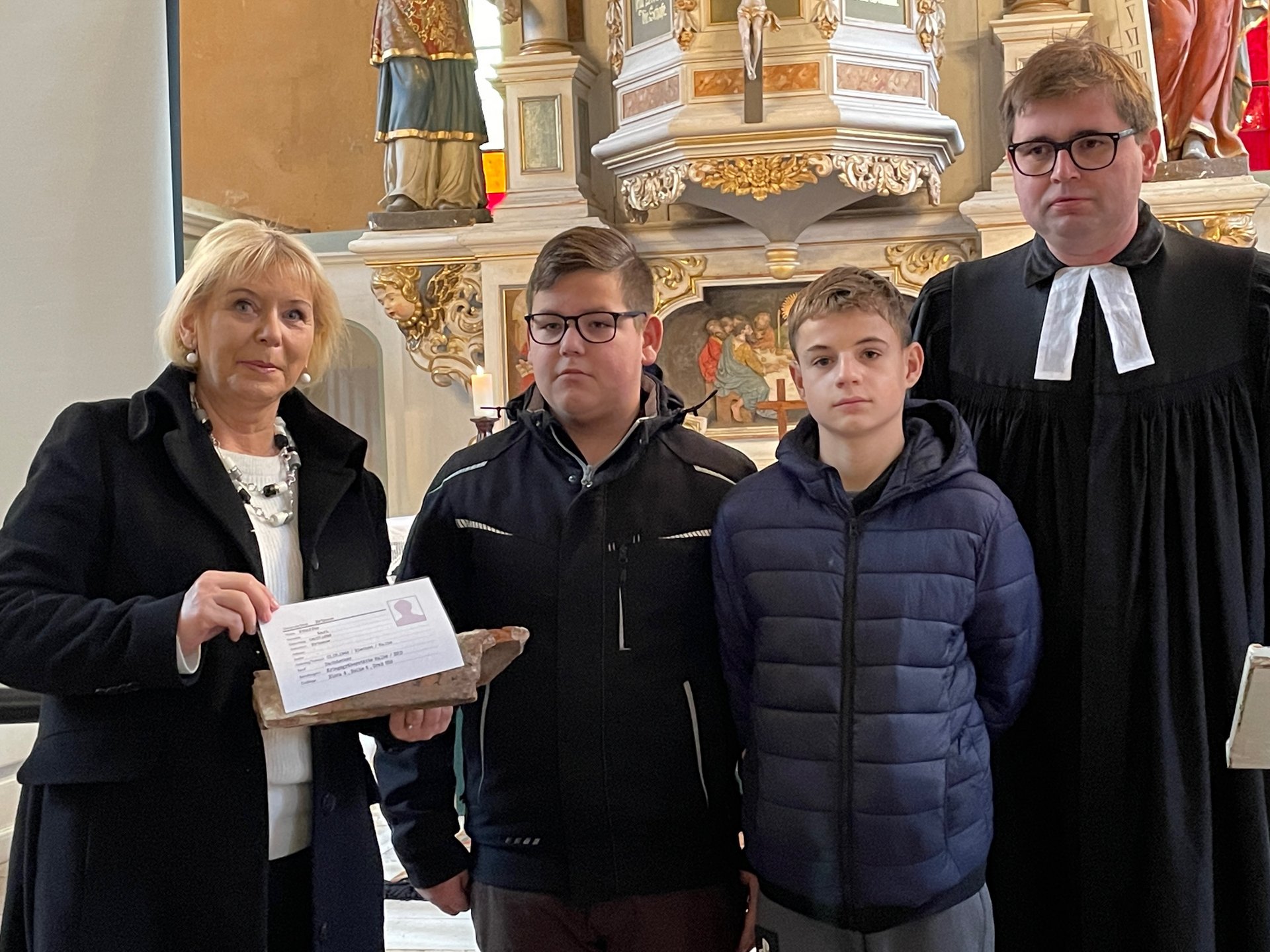 In seiner Predigt zum Volkstrauertag erinnerte Pastor Gienke an den gefallenen Dachdecker und überreichte dann gemeinsam mit dem Urenkel Landtagspräsidentin Prof. Dr. Ulrike Liedtke den aussagekräftigen Dachziegel. Die Landtagspräsidentin, die gleichzeitig Brandenburgs Volksbundsvorsitzende ist, versprach einen würdigen Ort dafür zu finden, denn durch solche Geschichten werde zum einen an die Menschen erinnert und zum anderen zu Frieden und Versöhnung gemahnt.