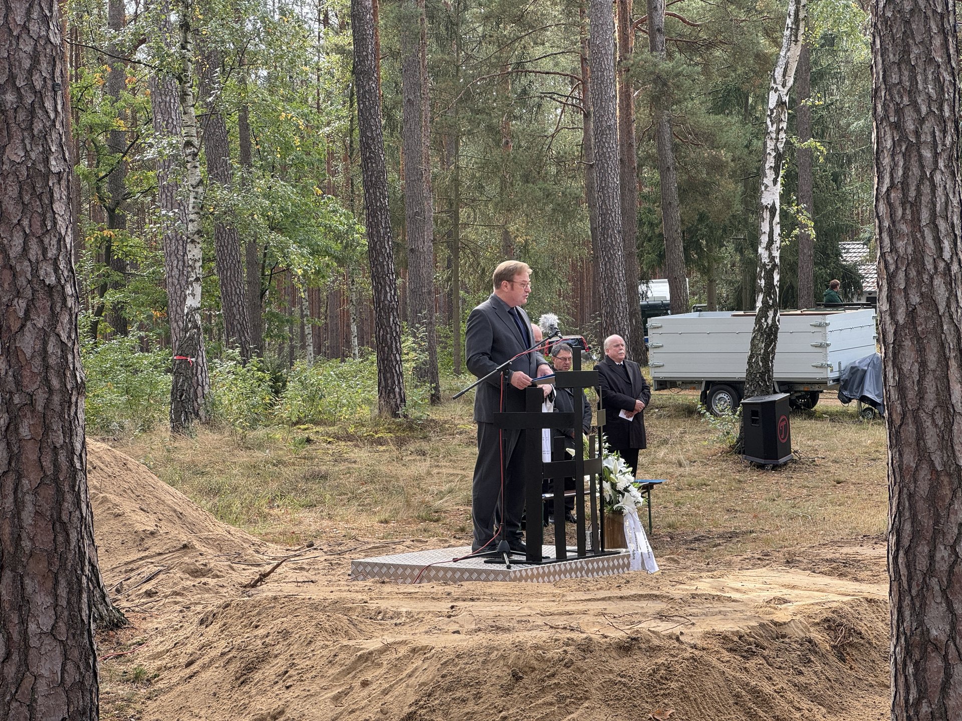 "Im Zeichen der fünf Kreuze des Volksbundes, uns und alle Menschen, draußen in der Welt, an die urchristlichen, friedvollen Gesten des Verzeihens, des Vergebens und des Hoffens auf Frieden zwischen den Menschen und den Völkern erinnern", sagte Landesgeschäftsführer Oliver Breithaupt zu der großen Zahl an Besuchern, zu den Angehörigen der Bundeswehr und zum Landespolizei-Orchester Brandenburg.