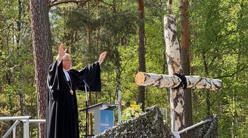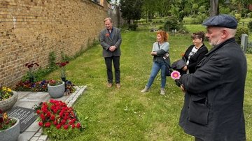 Galina Kalugina, Leiterin der Friedhofsverwaltung der Kath. Kirchengemeinde Bernhard Lichtenberg, ermöglichte das Aufstellen der Gedenktafel und ließ es sich nicht nehmen, einen Kranz niederzulegen. Das Ehepaar Gisela und Hans-Joachim Oppermann, das vom Volksbund von der Geschichte erfahren hatte, übernahm spontan die Finanzierung der Grabplatte – „weil helfen das einzig Richtige war.“